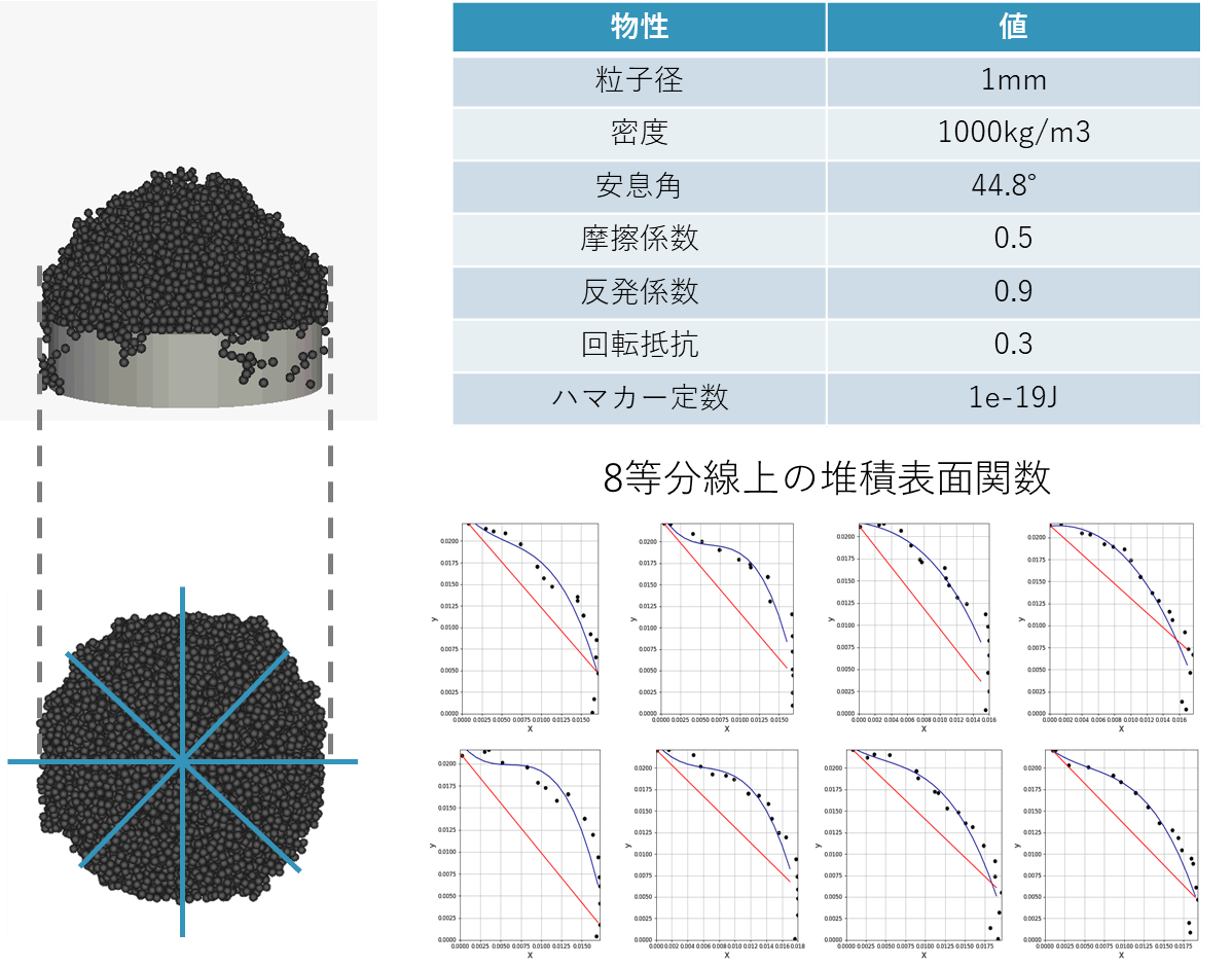 While the angle of repose is a commonly used indicator due to its relatively simple measurement, it’s important to note that real-life settled powders often do not form neat slopes. To define the angle of repose even when the slope is not well-defined, the angle is determined indirectly from the coordinates of the powder at specific positions. For example, in the funnel method, the angle of repose is calculated from the endpoints and the peak on the bottom surface.